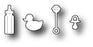 .2 x .7 inch bottle, .5 x .4 inch rubber duck, .2 x .7 inch rattle, .3 x .4 inch pacifier