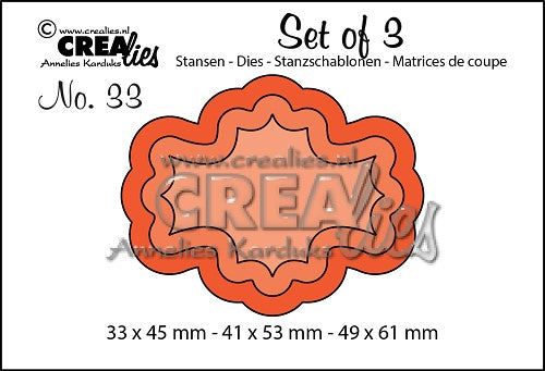 Click to expand Tap to zoom Set of 3 dies no. 33, Labels 7 by Crealies Save 0% $14.00 1 2 3 4 5 6 7 8 9 10+ Quantity Quantity Add to cart This item is a recurring or deferred purchase. By continuing, I agree to the cancellation policy and authorize you to charge my payment method at the prices, frequency and dates listed on this page until my order is fulfilled or I cancel, if permitted. Crealies CLSet33 33 x 45 mm - 41 x 53 mm - 49 x 61 mm