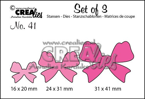 Click to expand Tap to zoom Set of 3 No. 41 - Bows by Crealies Save 0% $12.00 1 2 3 4 5 6 7 8 9 10+ Quantity Quantity Add to cart This item is a recurring or deferred purchase. By continuing, I agree to the cancellation policy and authorize you to charge my payment method at the prices, frequency and dates listed on this page until my order is fulfilled or I cancel, if permitted. 16 x 20 mm - 24 x 31 mm - 31 x 41 mm