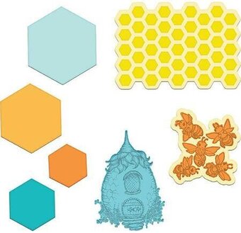 Busy worker bees, a charming hive, a captivating honeycomb die cut, along with a variety of varying sized hexagons are indeed the perfect assembling of dies to create paper projects that are "sweet as honey"! Create dynamic patterned backgrounds on card fronts using an assortment of hexagon die cuts, add a honeycomb accent and a swarm of busy worker bees among hand shaped flowers on scrapbook layouts, or create an adorable dimensional bee hive ready to house a whimsical honey bee maiden on altered art projects! Approximate Image Sizes: 1. Honey Bee Bungalow: 2.5" x 3.25", 2. Swarming Worker Bees: 2.25" x 2.0", 3. Honeycomb: 4.0" x 2.75", 4. Hexagon 1: 2.25" X 2.5", 5. Hexagon 2: 2.0" x 2.25", 6. Hexagon 3: 1.5" x 2.0", 7. Hexagon 4: 1.25" x 1.5".